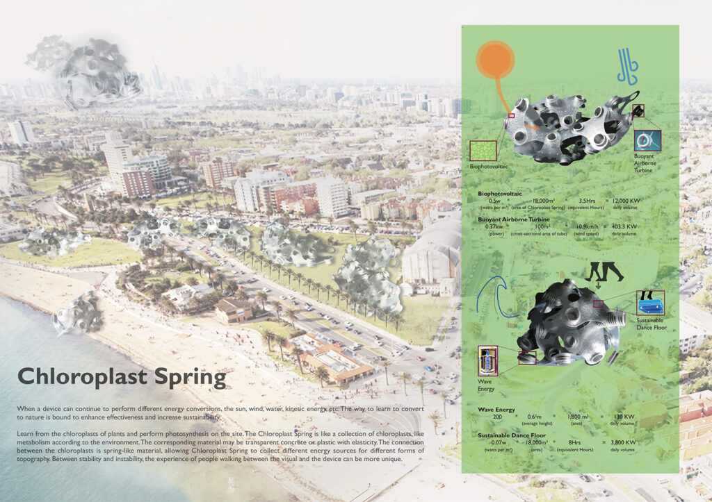 - 《Chloroplast Spring》(2018 LAGI 國際競圖):受植物「葉綠體」啟發,設計了一個仿生能源裝置,可同時收集生物光伏 (BPV)、波浪、風力和動能(舞蹈地板)等多元再生能源。